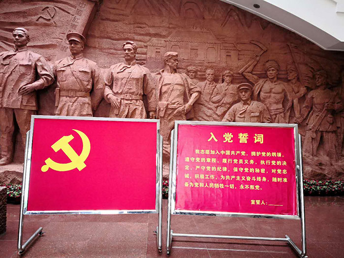 在紀(jì)念館內(nèi),全體黨員面對黨旗,再次鏗鏘有力地舉臂握拳,莊嚴(yán)宣誓,重溫入黨誓詞,堅(jiān)定理想信念,弘揚(yáng)革命意志。